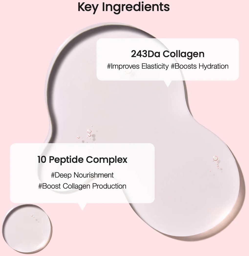 Ethylhexyl Palmitate, Cetyl Ethylhexanoate, Polyglyceryl-10 Isostearate, Polyglyceryl-6 Dicaprate, Sorbitan Sesquioleate, Polyglyceryl-2 Laurate, Aqua, Pyrus Communis (Pear) Fruit Extract, Rosa Damascena Flower Water, Eclipta Prostrata (Bhringraj) Extract, Iris Florentina Root Extract, Cucumis Melo Seed Extract, Hedera Helix (Ivy) Leaf/Stem Extract, Melia Azadirachta Leaf Extract, Caprylyl Glycol, Vitis Vinifera Seed Oil, Helianthus Annus (Sunflower) Seed Oil, Simmondsia Chinensis (Jojoba) Seed Oil, Ethylhexylglycerin, Moringa Oleifera Seed Oil, Butylene Glycol, 1.2-Hexanediol, Collagen Extract, Acetyl Hexapeptide-8, Tocopherol (Vitamin E), Oligopeptide-1, Copper Tripeptide-1, Palmitoyl Pentapeptide-4, Palmitoyl Tripeptide-5, Tripeptide-1, Hexapeptide-9, Palmitoyl Tripeptide-38, Pentapeptide-4, Hexapeptide-12