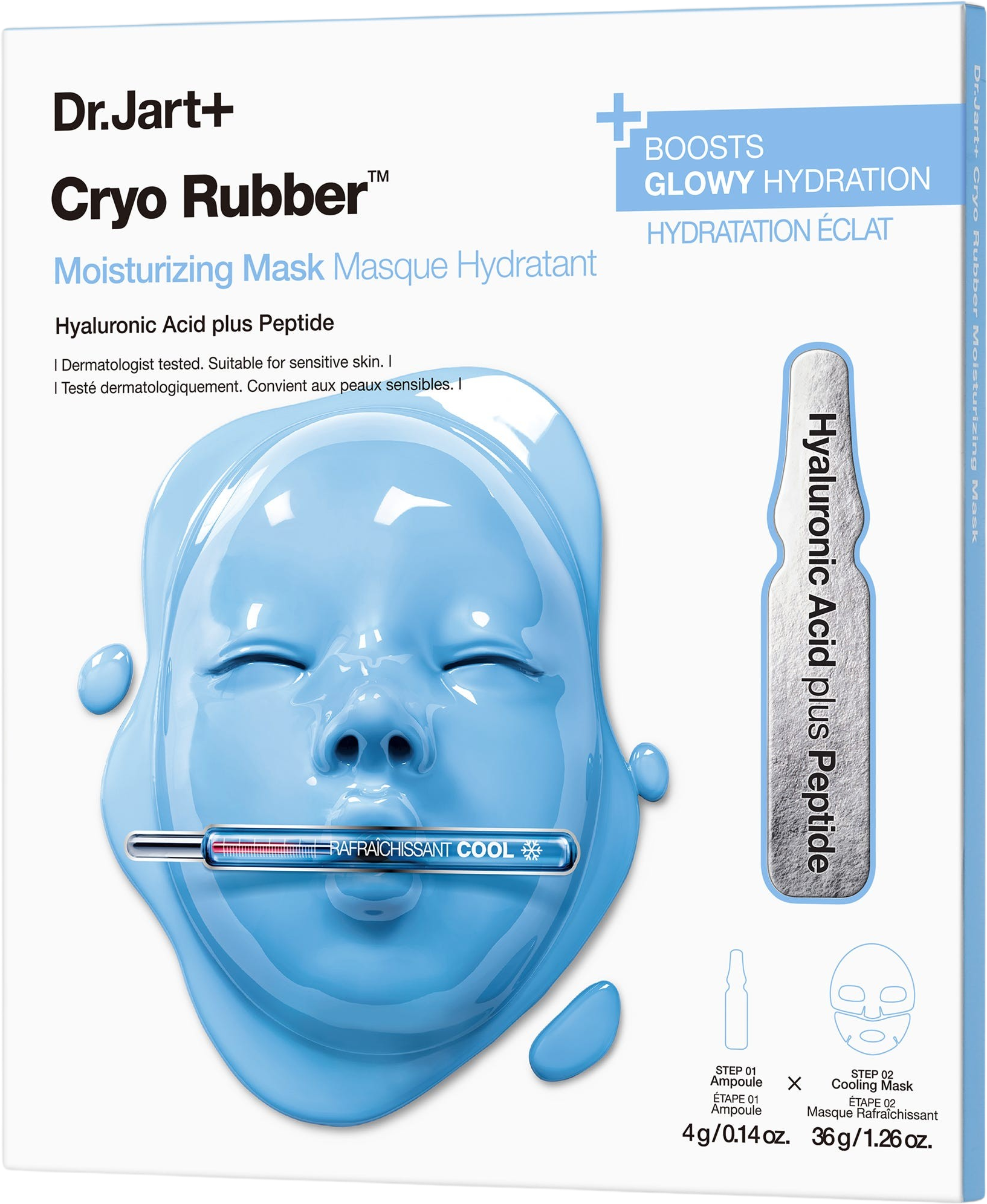 Cryo Rubber™ Moisture Mask od Dr. Jart+ to inteligentna maska do twarzy inspirowana odkryciami krioterapii (leczenia zimnem). Oprócz maski w zestawie znajduje się również ampułka wypełniona żelowym serum. Zapewnia ono skórze intensywne nawilżenie dzięki wysoce skoncentrowanemu kwasowi hialuronowemu, który jest następnie umiejętnie zamykany przez maskę. To połączenie zapewnia również przyjemny efekt chłodzenia. Zostaniesz nagrodzony uczuciem świeżej i miękkiej skóry w mgnieniu oka.