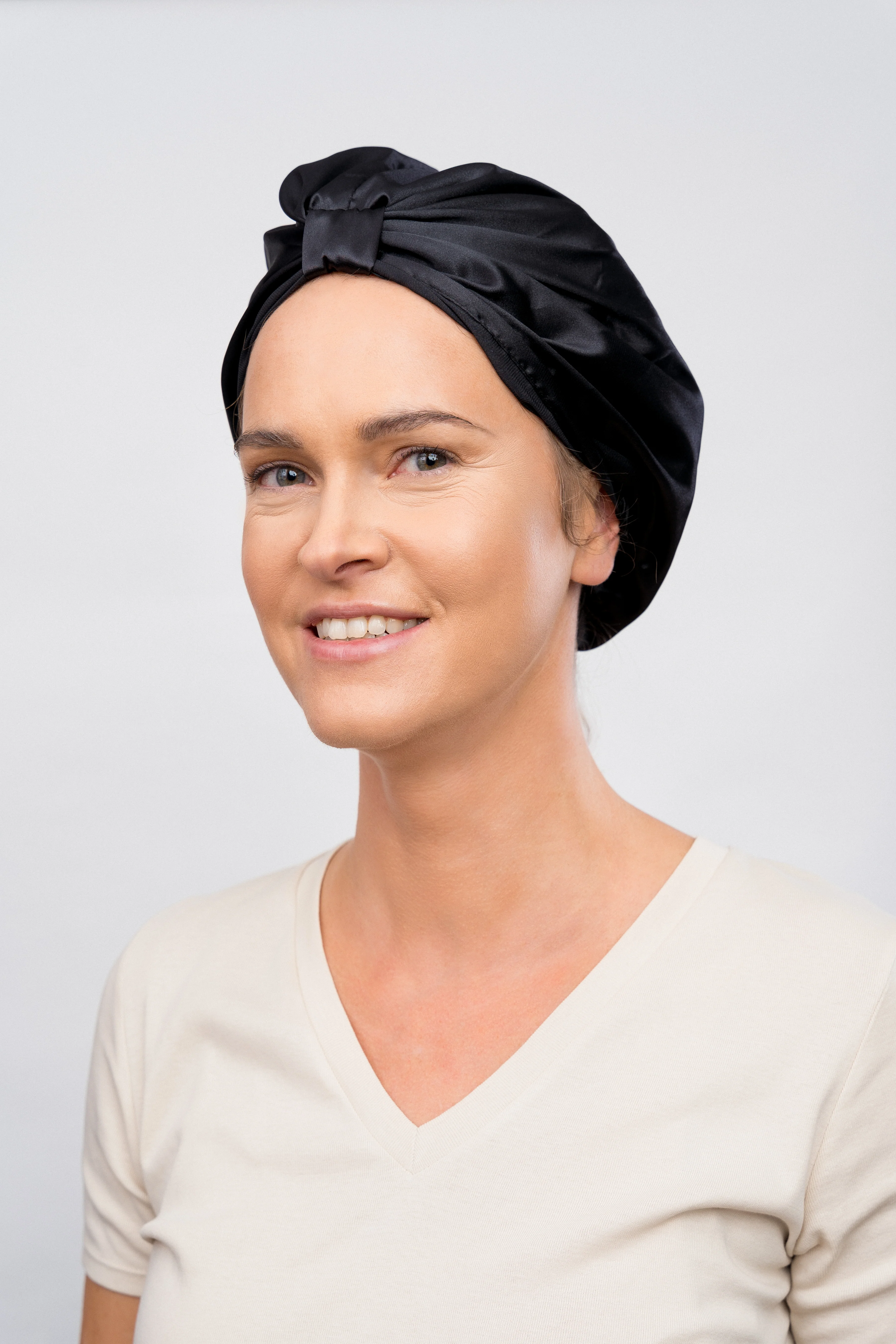 - Teraz naciągnij przednią część satynowej czepka na włosy, upewniając się, że wszystkie pasma są pod spodem.