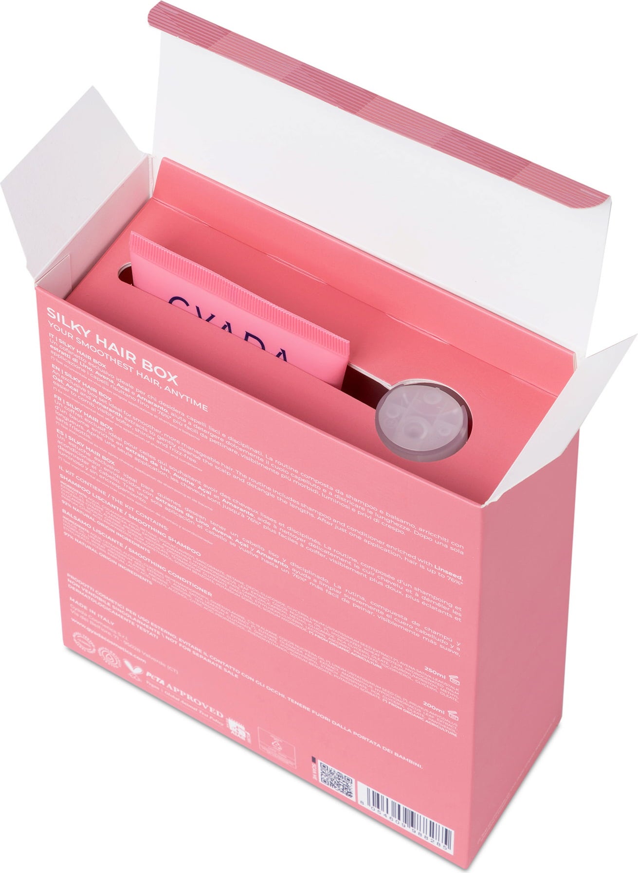 Silky Hair Box zawiera dwa produkty do pielęgnacji włosów, które zostały opracowane specjalnie dla włosów prostych. Duet szamponu i odżywki jest wzbogacony ekstraktami z lnu, owsa, acai i amarantusa, delikatnie oczyszcza skórę głowy i rozczesuje włosy. Zapewnia przyjemne rozczesywanie i połysk.
