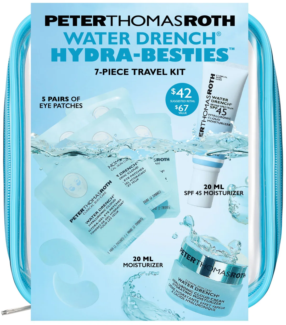 Zestaw Hydra Besties 7-Piece Travel Kit od Peter Thomas Roth zawiera popularne produkty Water Drench®, z których wszystkie zawierają kwas hialuronowy i zapewniają optymalną pielęgnację nawilżającą. Produkty są zapakowane w torebkę wielokrotnego użytku z zamkiem błyskawicznym, którą można łatwo schować do torebki lub bagażu podręcznego.