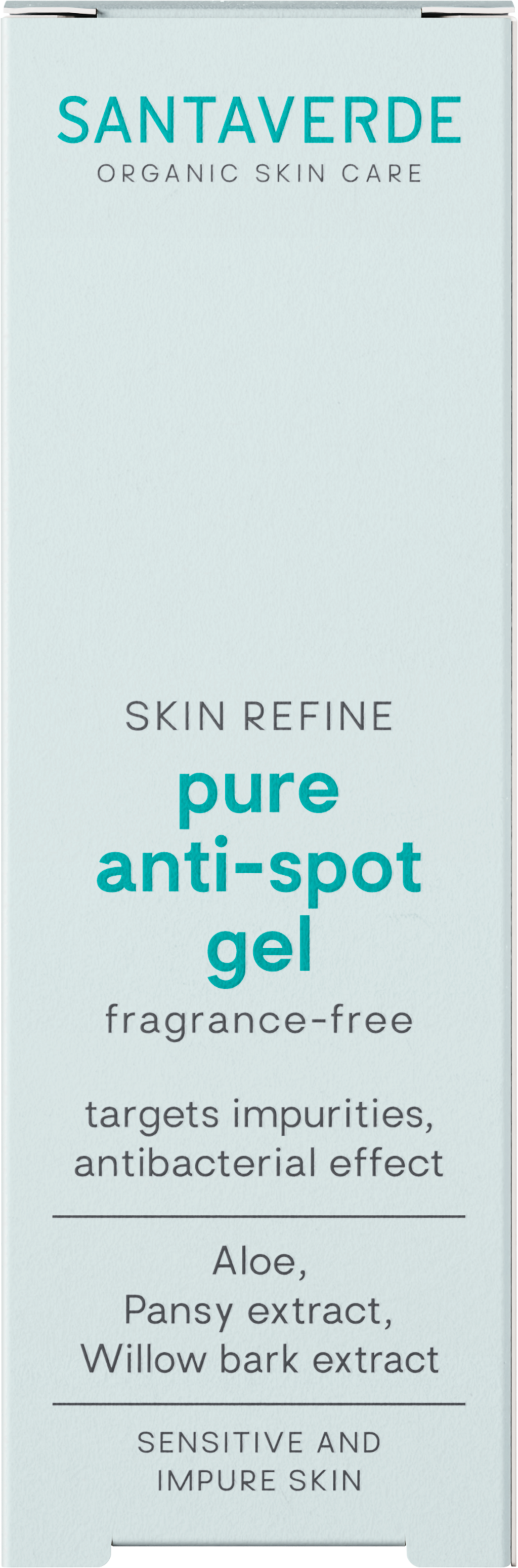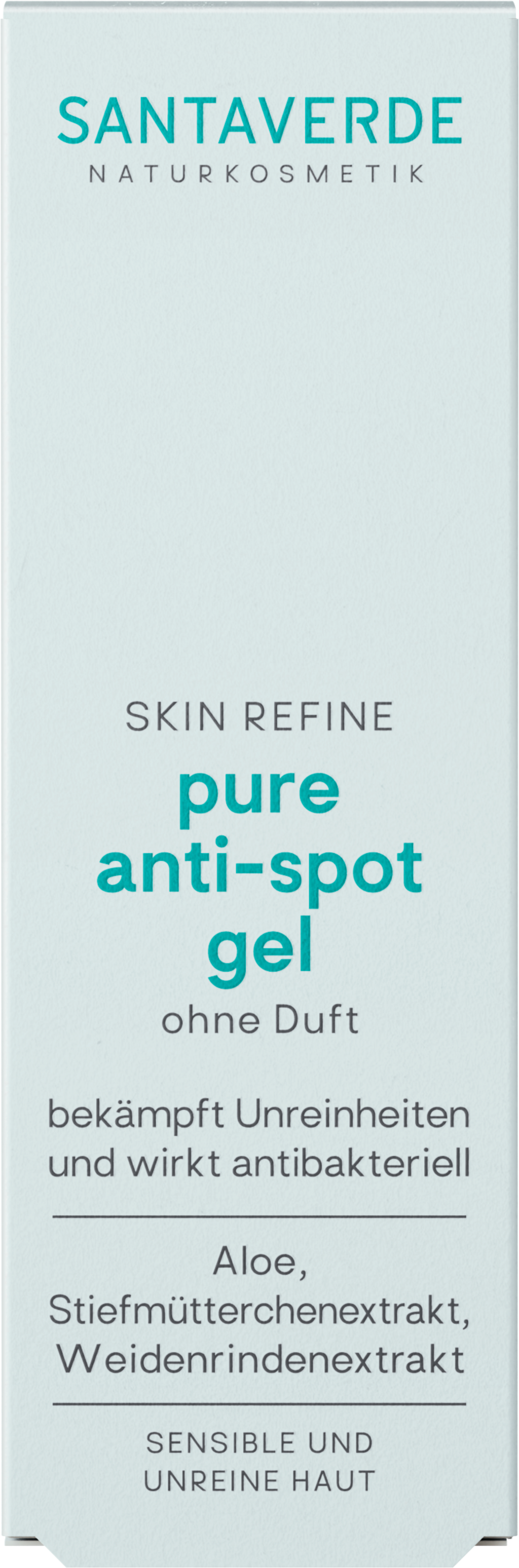 Dziękipure anti-spot Gel bez zapachu Santaverde, nieestetyczne niedoskonałości znikają błyskawicznie. Cynk, kwas salicylowy z kory wierzby i ekstrakt z kwiatów bratka oczyszczają i łagodzą niedoskonałości lub podrażnienia skóry. Czysty sok z aloesu i olej z pestek dzikiej róży zapewniają intensywną pielęgnację i pozostawiają skórę aksamitnie miękką.
