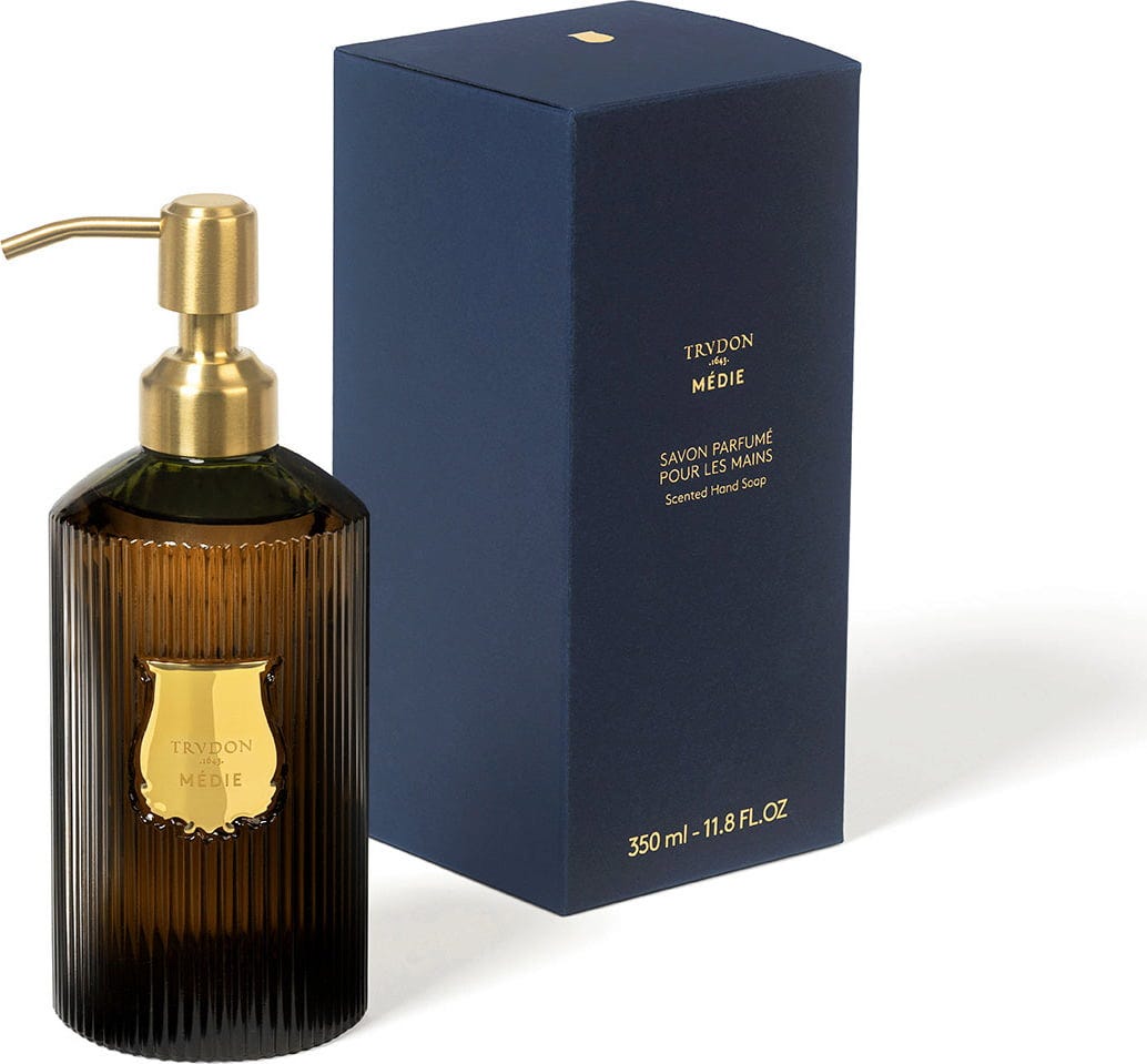 Hand Liquid Soap Medie od Trudon nie tylko delikatnie myje dłonie, ale także nadaje Twojej skórze i łazience wyjątkowy, niepowtarzalny zapach. Szklana butelka nadaje się do wielokrotnego napełniania i doskonale sprawdza się jako luksusowy przedmiot dekoracyjny, upiększający każdą łazienkę czy toaletę.